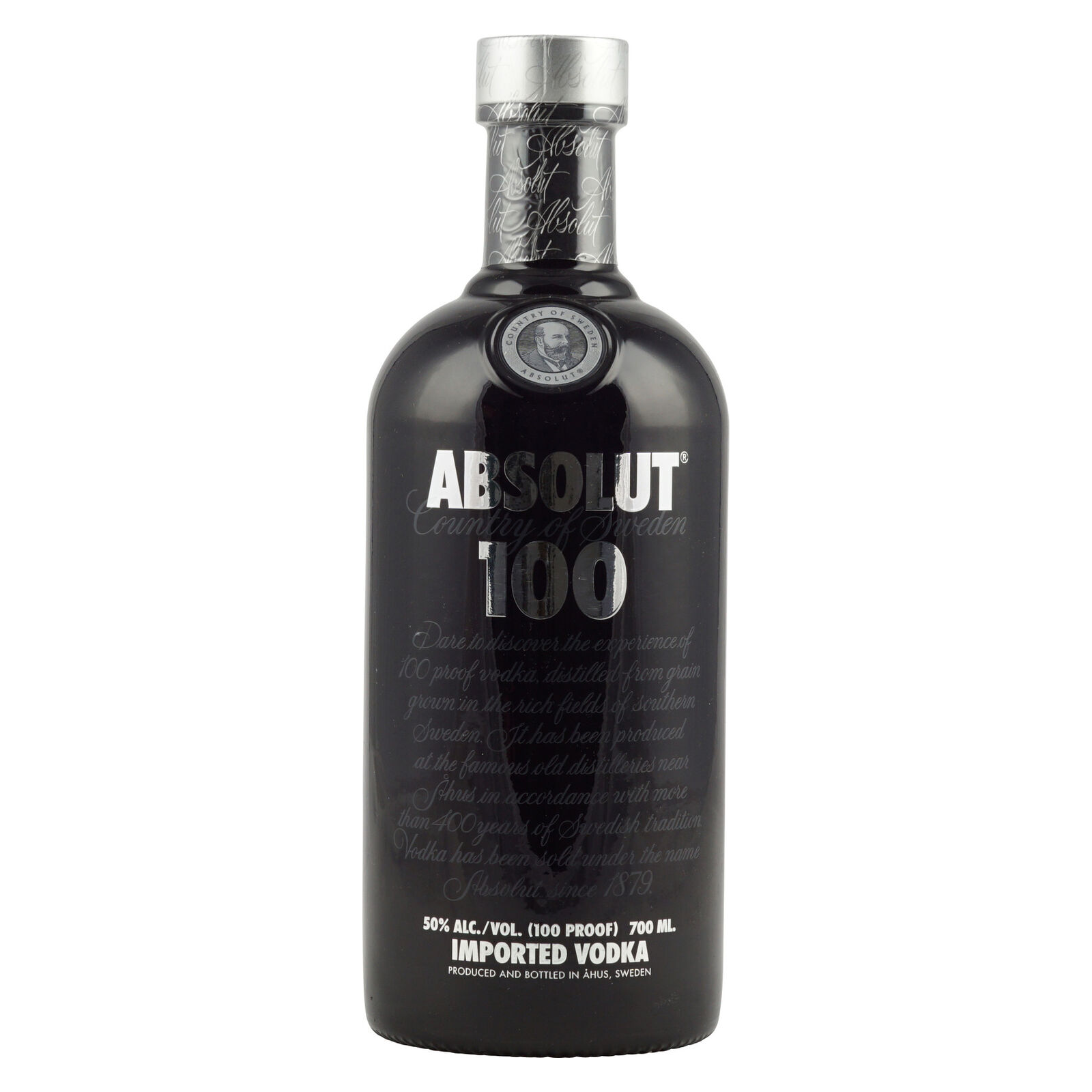 ABSOLUT 100 BLACK indeholder sådan set den samme vodka som den originale Absolut Vodka – den er bare kun blendet ned til 50% alkohol. Der er altså, groft sagt, mindre vand og mere vodka i den. Som den klassiske Absolut er ABSOLUT 100 lavet på særligt udvalgt svensk vinterhvede. som dyrkes i Åhus. Kornet destilleres nænsomt på column stills og tilsættes derefter grundvand fra en brønd, der ligger tæt på selve destilleriet. Der tilsættes vand indtil vodkaen rammer 50% alkoholstyrke. Til sidst filtreres vodkaen grundigt og ABSOLUT 100 er klar til dig!
