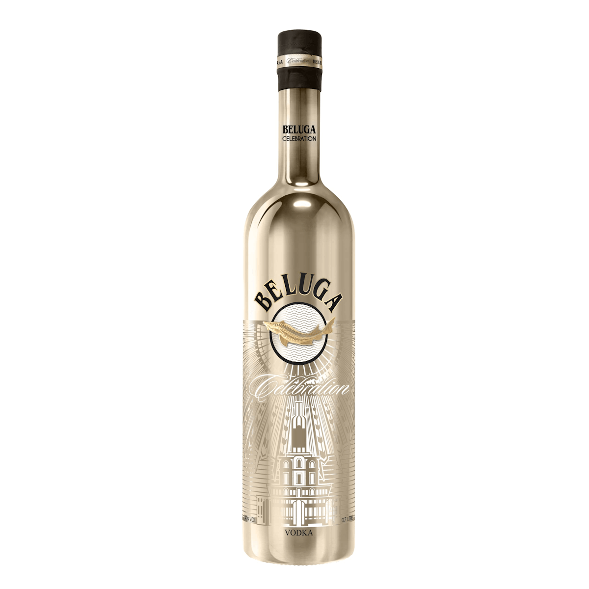 Den specielle BELUGA CELEBRATION flaske fanger øjet med det samme. Processen som bruges til belægningen kalder “termal fordampning”. Flasken bliver beklædt med en dobbelt platinbelægning, hvilket foregår i et lukket vakuum-kammer. Det giver en perfekt, ensartet metallisk overflade. Denne overflade bliver derefter belagt med bladguld. Til sidst sættes Beluga-symbolet på med hånd. Total perfektion!